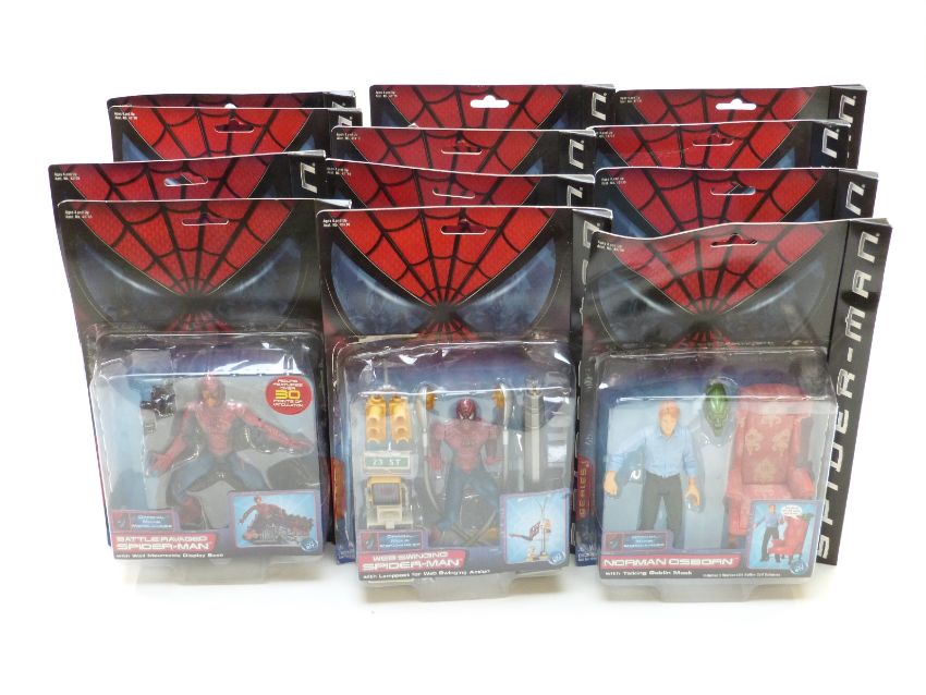 Twelve Toy Biz Spider-Man action figures together with a Bluebird Spider-Man Kingpin's Crime Central, all in original boxes