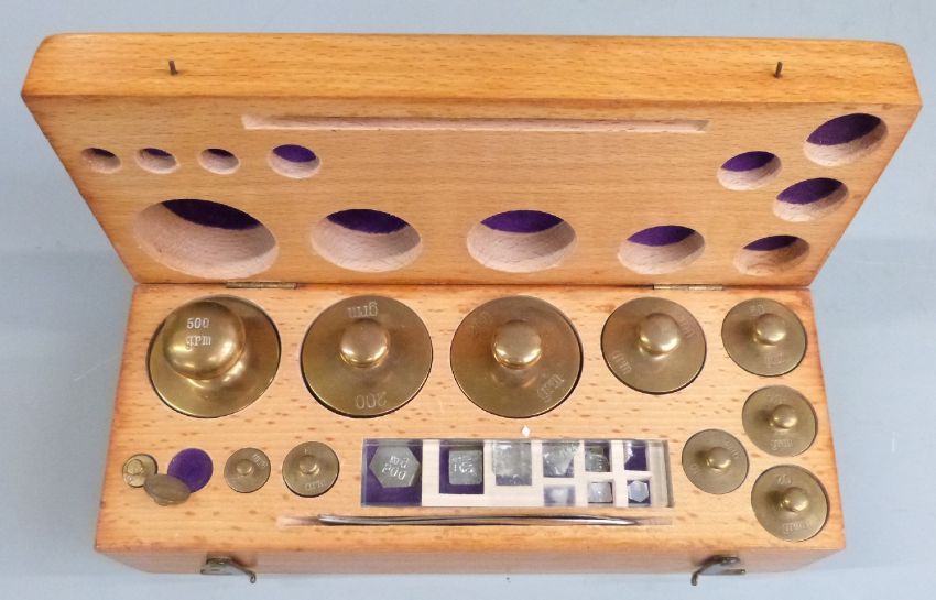 Six cased sets of metric weights, largest weight 500g