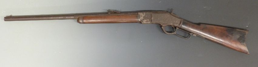 Winchester Model 1873 .44 saddle ring underlever rifle with adjustable pop-up sights, steel butt plate and mounts and butt plate and 24 inch part octagonal barrel, overall length 109cm. PLEASE NOTE THAT A VALID RELEVANT FIREARMS/SHOTGUN CERTIFICATE IS REQUIRED TO HANDLE/PURCHASE THIS ITEM.