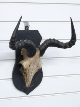 Taxidermy goat skull and horns mounted on shield shaped wooden plaque, width of horns 37cm, 36cm from tip of horns to bottom of shield.