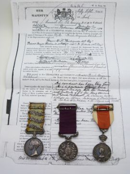 Victorian British Army medal trio comprising Crimea Medal with clasp for Alma, Balaclava & Sebastopol named to 3597 Benjamin Whitehead 28th Regiment of Foot. Whitehead was one of only 23 men of the 28th to receive the Balaclava clasp. The Abyssinia War medal named to 1511 B.Whitehead 1st Battalion K.O.R. Regt and Long Service and Good Conduct Medal to 1525 B.Whitehead 55th Regiment of Foot, with paperwork