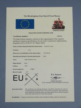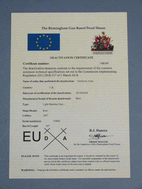 Deactivated Bren MKII .303 light machine gun with wooden stock stamped S.III, pistol grip, canvas sling, ladder sight, frame stamped M/67 1943, bi-pod and 24 inch flared barrel, overall length 117cm, serial number T5805, with deactivation certificate dated 2018