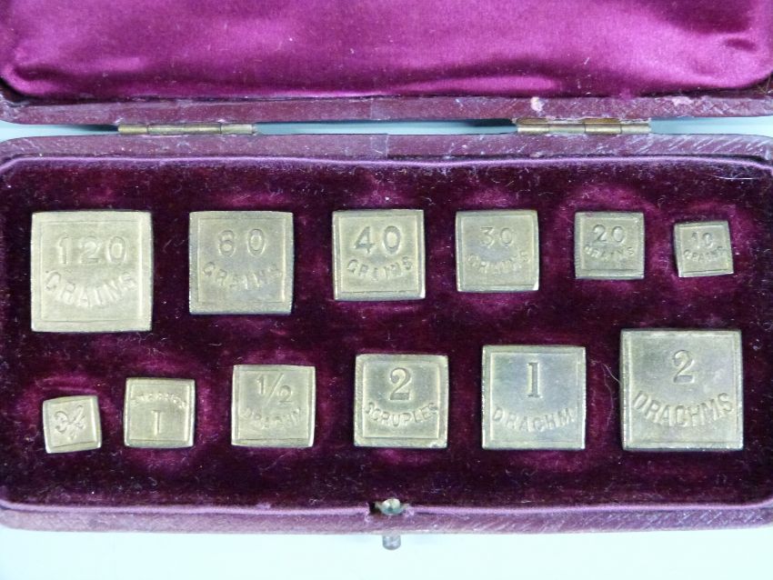 Leather cased 19thC or early 20thC set of apothecary weights from 120 grains downwards