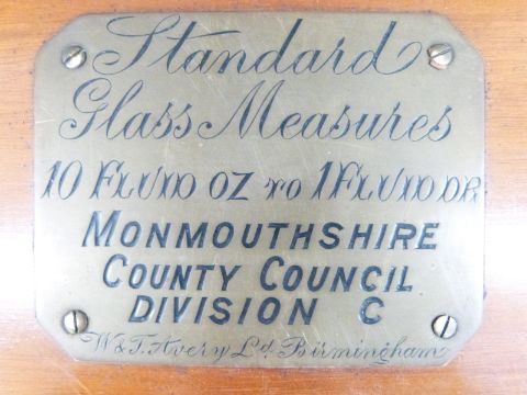 Edward VII cased set of Monmouthshire County Council standard glass measuring cylinders, largest 1/2 pint, all but one numbered 2897 and with Royal ciphers and portcullis marks for Edward VII 1907 to Elizabeth II 1961, the case having brass plaque to lid reading Standard Glass Measures 10 fluid oz to 1 fluid dr, Monmouthshire County Council division C, W & T Avery Ltd Birmingham,  width of case 53cm, ex Monmouthshire Trading Standards