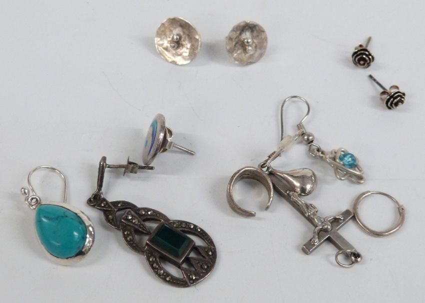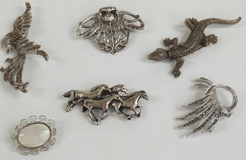 Four silver rings, silver horse brooch, silver earrings, silver heart locket, etc
