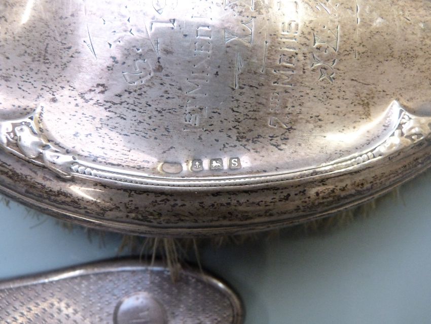 Three hallmarked silver mounted dressing table items, Victorian hallmarked silver cherub London 1885, white metal bowl marked 84, Eastern heart shaped box, hallmarked silver lidded hip flask etc