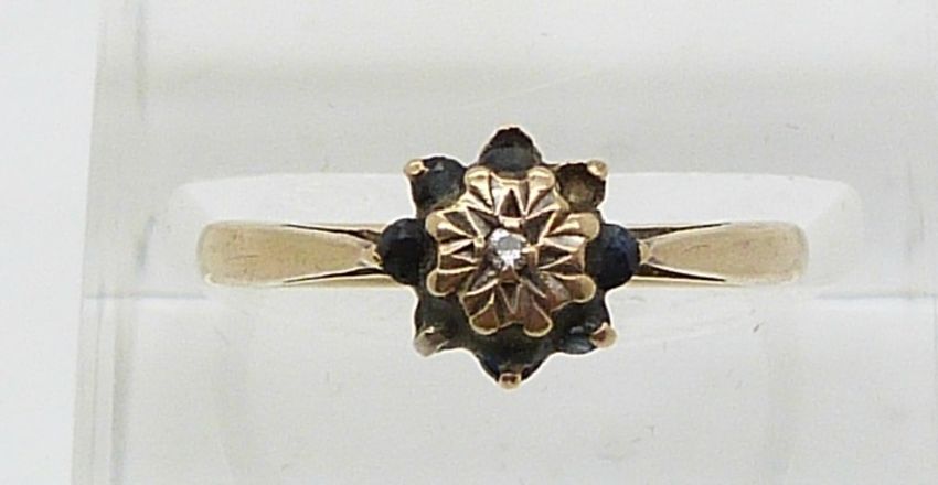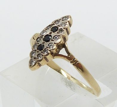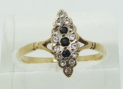A 9ct gold ring set with a diamond and sapphires and a 9ct gold ring set with sapphires in a marquise shaped mount