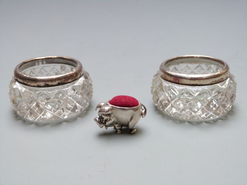 A pair of hallmarked silver mounted cut glass salts and a small novelty pig pin cushion marked 925