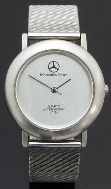 Mercedes Benz gentleman's wristwatch with silver hands and dial, stainless steel case and quartz movement, on stainless steel bracelet, case diameter 34mm.