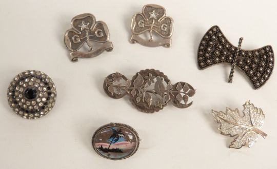 A white metal buckle, silver pocket watch, jet brooch, Victorian hallmarked silver brooch, one dollar coin, silver bracelet etc