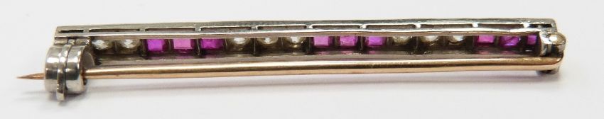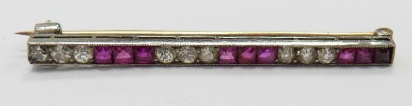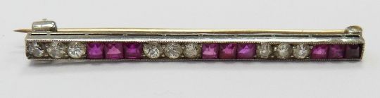 Art Deco gold and platinum brooch set with round cut diamonds and square cut rubies, width 4cm x length 0.2cm