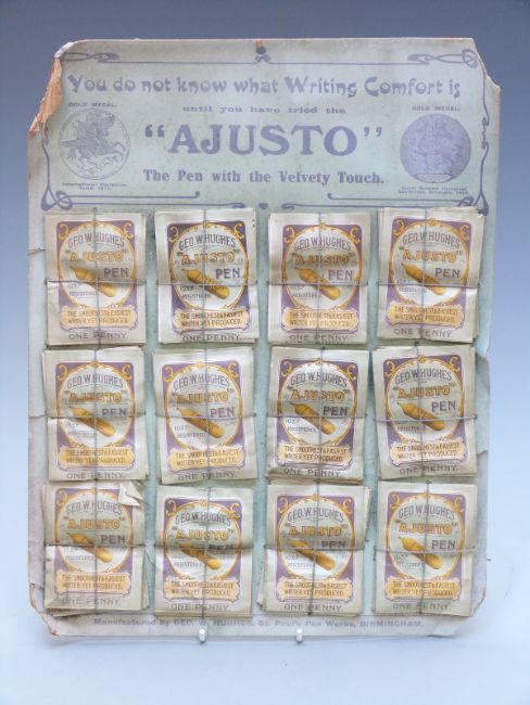 George W Hughes Ajusto advertising shop pen nib display with 72 packets of pen nibs mounted on card, 34.5 x 27cm.
