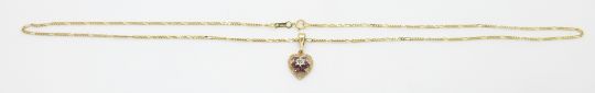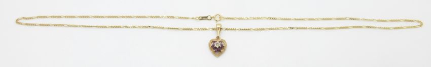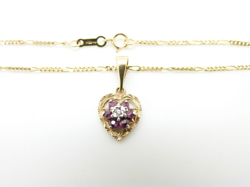 A 9ct gold pendant set with a diamond and rubies on a 9ct gold chain, 2.6g, 24.5cm drop