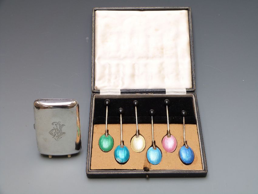 Cased set of Elizabeth II guilloché enamel backed hallmarked silver coffee bean spoons, Birmingham 1956 maker Turner & Simpson, together with a hallmarked silver cigarette case, weight 110g