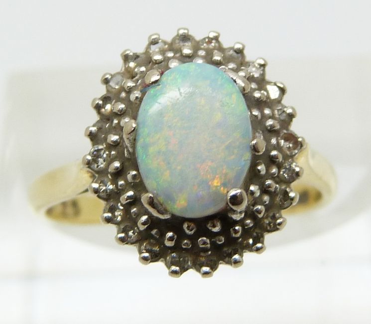 An 18ct gold ring set with an opal and diamonds (size K/L)