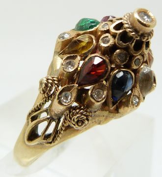 A 18ct gold ring set with diamonds, a pink sapphire, emerald, tigers eye, garnet, citrine, topaz etc (size P)