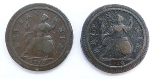 George I 1719 halfpennies, one F+-VF, the other poor fine