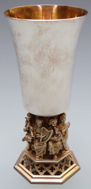 Aurum limited edition (209/700) Lincoln cathedral hallmarked silver commemorative goblet, with musicians above a pierced border and hammered decoration to the bowl, London 1981 maker Hector Miller, weight 344g, in box with paperwork