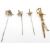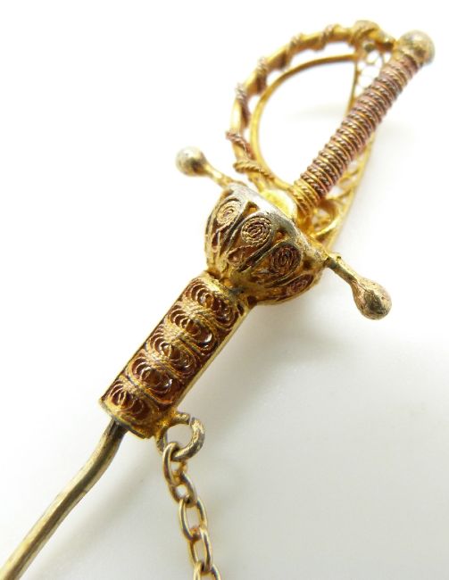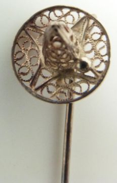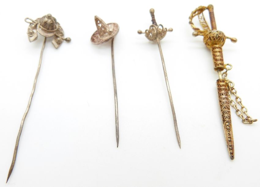Four filigree stick pins, one in the form of a horseshoe and whip, two swords and a hat