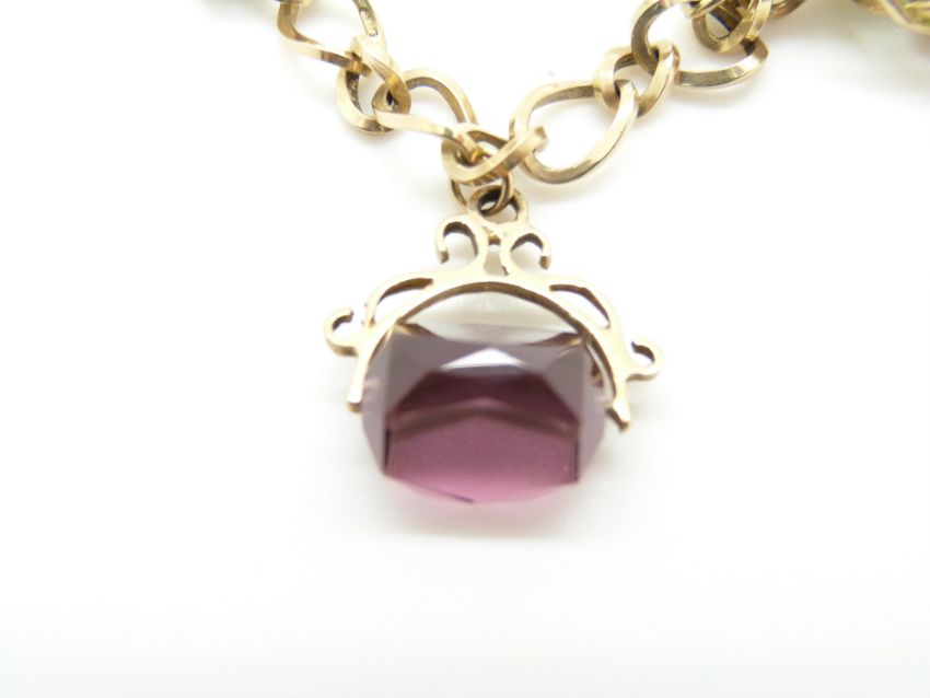 A 9ct gold charm bracelet with two 9ct gold fobs, two 9ct gold swivel fob charms and a ring charm, 30.8g