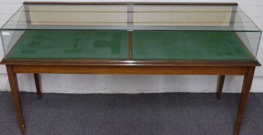 Early to mid 20thC mahogany bench display or haberdashery shop cabinet with twin doors to rear, raised on four square tapering legs, L183 x D58 x H97cm