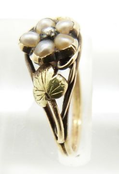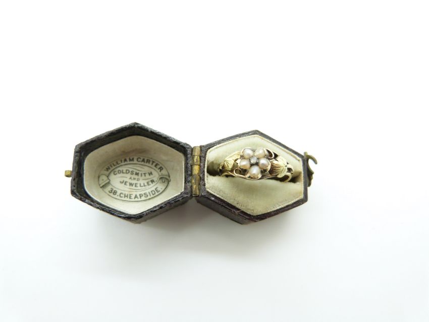 An early Victorian ring set with a rose cut diamond surrounded by pearls, in original box for William Carter, 38 Cheapside