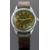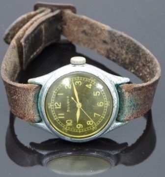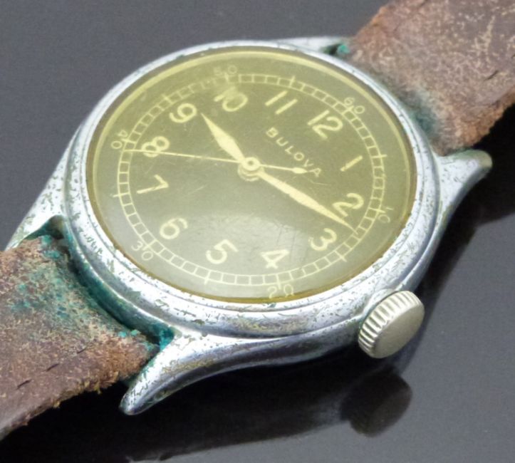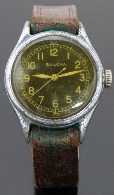 Bulova military style gentleman's wristwatch with white hands and Arabic numerals, railroad minute track, black dial, silver plated case and signed movement, on brown leather strap, case diameter 32mm.