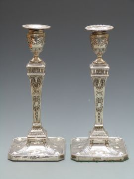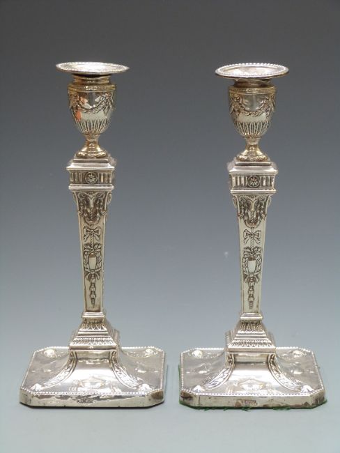 Edward VII pair of hallmarked silver candlesticks in the neoclassical style, Sheffield 1908 maker Walter Latham & Son, height 29cm