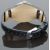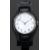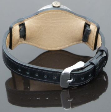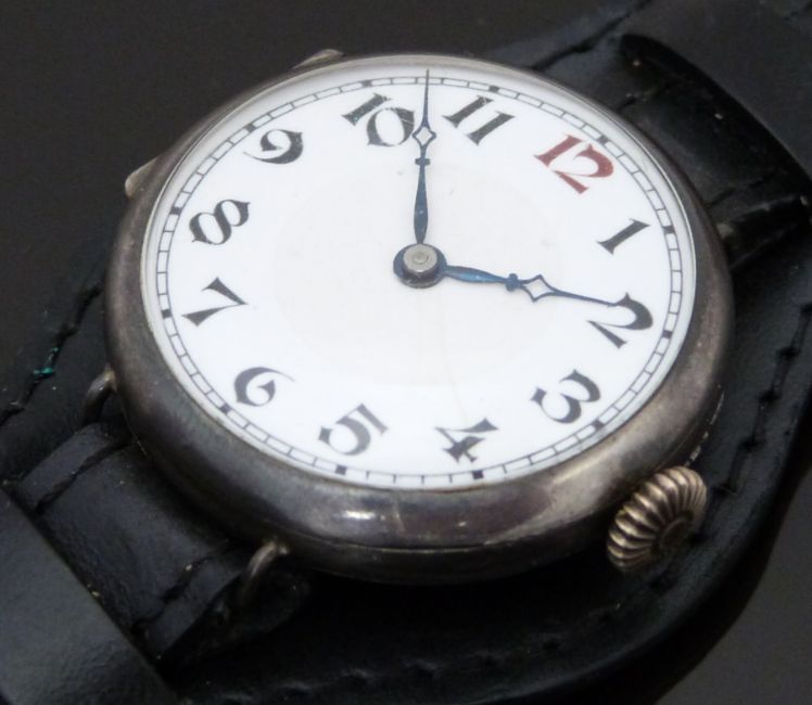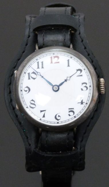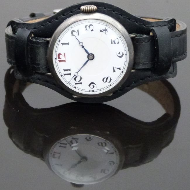 George Stockwell silver military style gentleman's wristwatch with blued hands, Arabic numerals, stepped white enamel dial and oak leaf engraved movement, on black leather strap, case diameter 32mm.