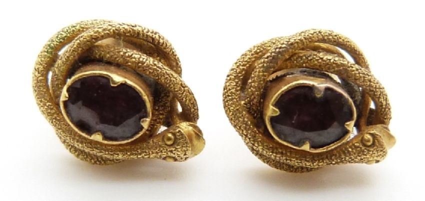 A pair of Victorian earrings set with foiled garnets surrounded by snakes with textured detail