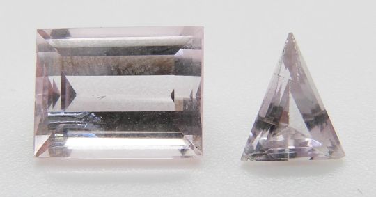 A rectangular cut morganite measuring approximately 2.7ct and a triangular cut morganite
