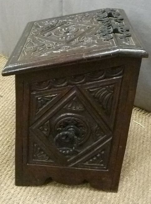 Carved oak coal or similar storage box, W53 x D40 x H51cm