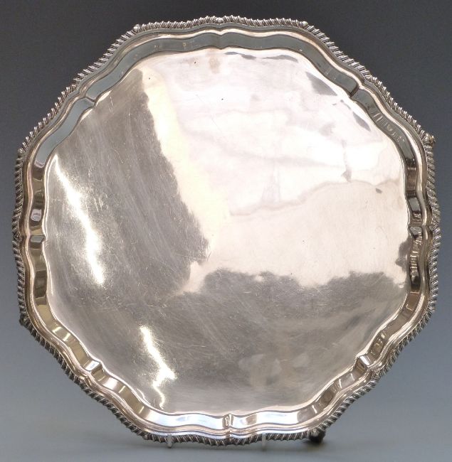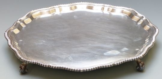 Hallmarked silver salver with gadrooned and rope twist rim raised on four scrolling feet, Sheffield 1941 maker Jay, Richard Attenborough Co. Ltd., diameter 36cm, weight 1280g