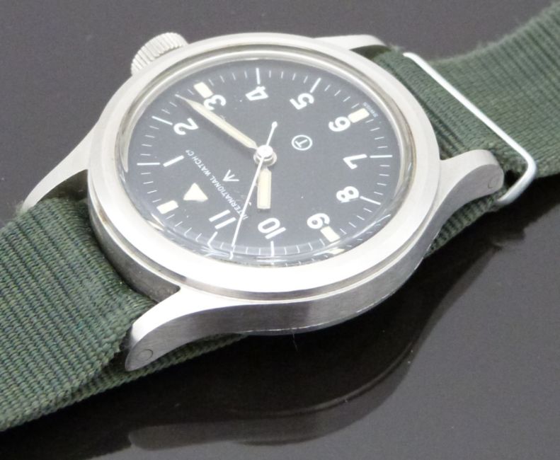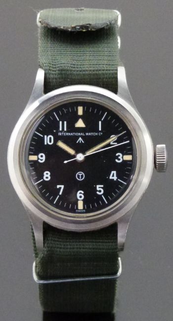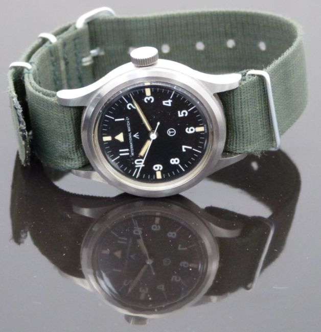International Watch Co IWC Mk.11 military pilots wristwatch with luminous hands and quarter hour markers, white seconds hand and Arabic numerals, ministry broad arrow to the black dial, stainless steel case and signed and military marked calibre 89 movement, on green NATO style canvas strap, case diameter 36mm, serial number 1211350.