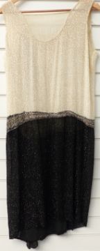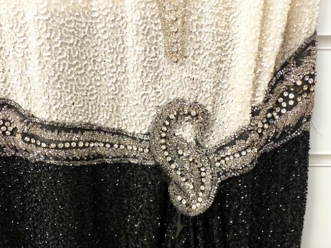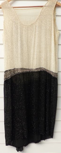 Art Deco flapper dress with beaded feather motif to the bodice and rhinestone embellished drop waist