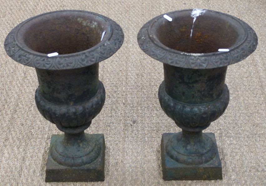 A pair of late 19th/20th century cast iron pedestal campana urns/jardinieres with impressed decorative border, height 46cm