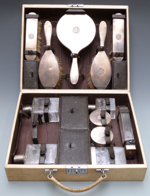 Asprey cased hallmarked silver travelling set comprising hand mirror, four brushes and silver lidded cut glass bottles and pots, London 1938, the fitted case with various lidded compartments and straps to hold the set, width 35cm