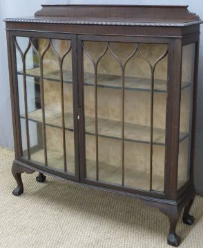 Early 20thC mahogany bow fronted glazed display cabinet raised on ball and claw feet, W122 x D36 x H130cm