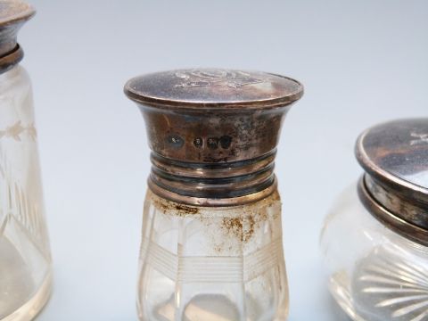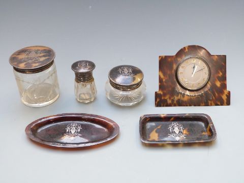 Six tortoiseshell pique work dressing table items comprising clock, three hallmarked silver lidded items, two being London 1922 and two trays, width of clock 11.5cm