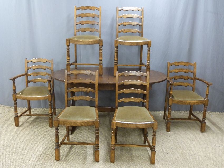 Oak dining table, W153 x D97 x H75 and six (4+2) chairs