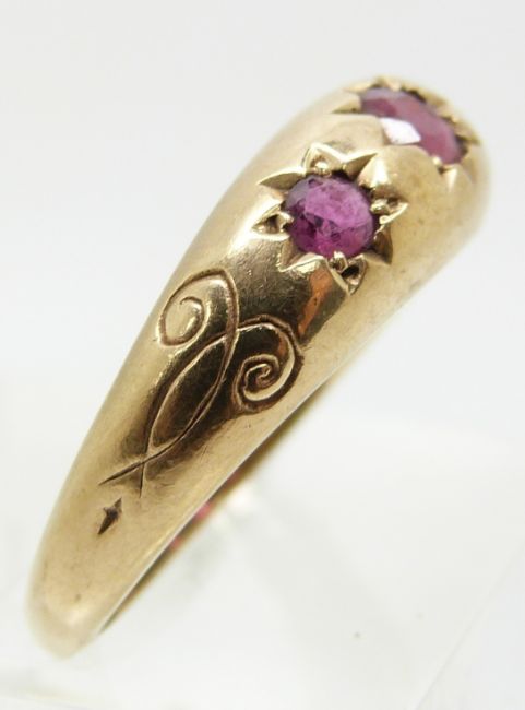 A 9ct gold ring set with three rubies in star settings (size P)