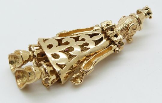 A 9ct gold pendant depicting a clown with moving arms and legs set with rubies, emeralds, cubic zirconia and blue stones, 18.2g, 6.5cm