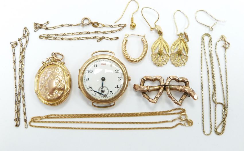 A 9ct gold watch, 9ct gold brooch, locket, chains etc