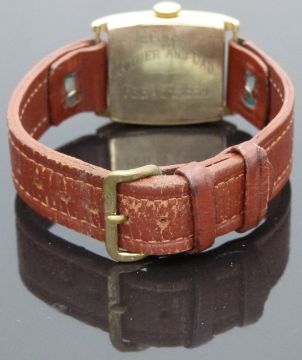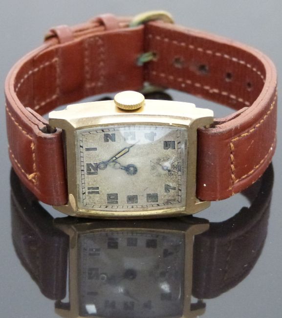 Vertex 9ct gold gentleman's cushion shaped Art Deco wristwatch with subsidiary seconds dial, luminous hands, Arabic numerals, champagne dial and 15 jewel movement, on brown leather strap, case diameter 25mm, serial number X13173.