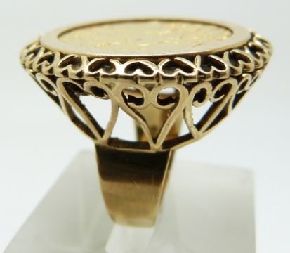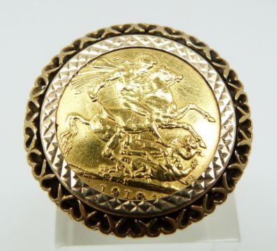 A 9ct gold ring set with a 1918 gold full sovereign, 14.2g (size K)