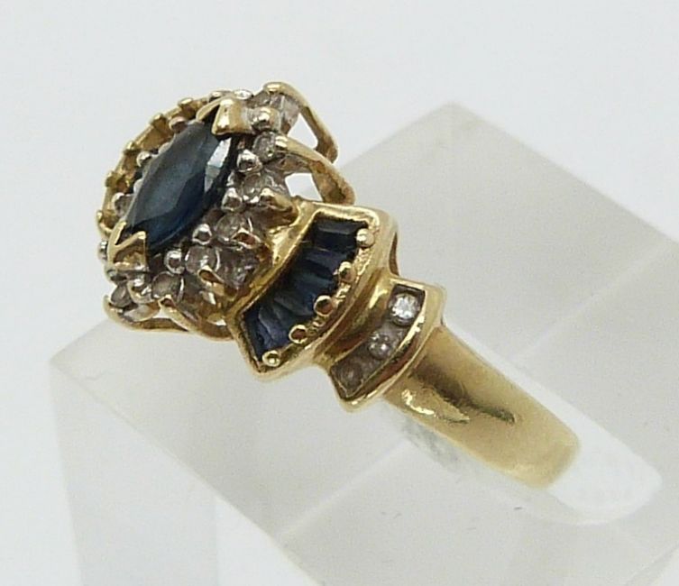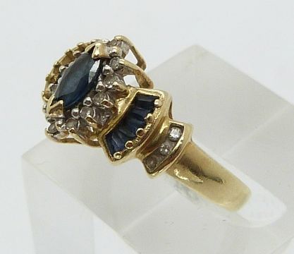 A 14ct gold diamond ring set with a marquise cut sapphire and diamonds (size M)