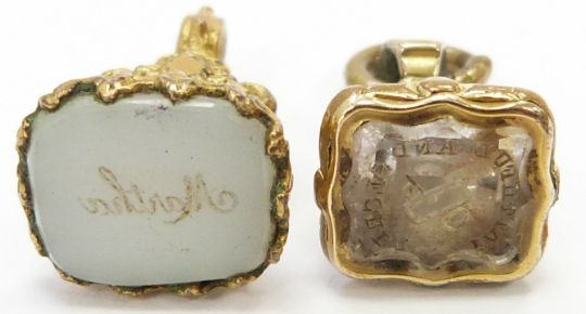 Two Victorian intaglio seals, one engraved 'beautiful and secret', a Victorian fob and a gold plated Mabie, Todd & Co pencil
