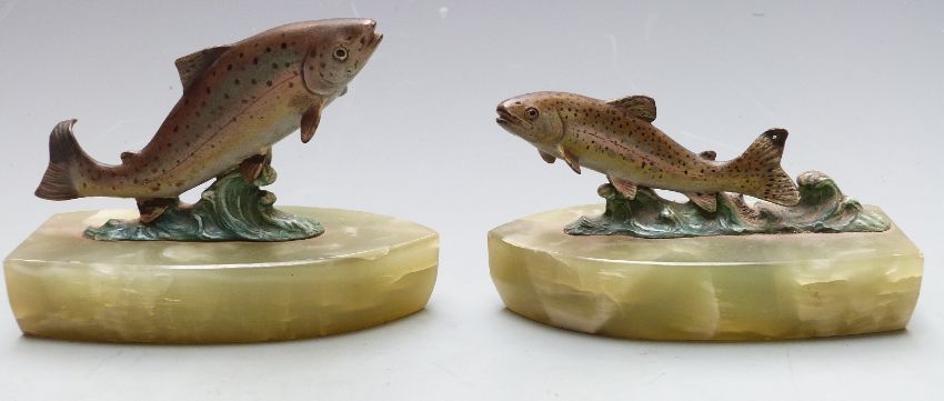 Two cold painted bronze Art Deco style salmon on onyx bases length 13.5cm