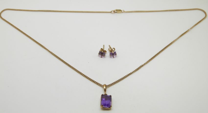 A 9ct gold necklace set with an amethyst and a pair of similar earrings