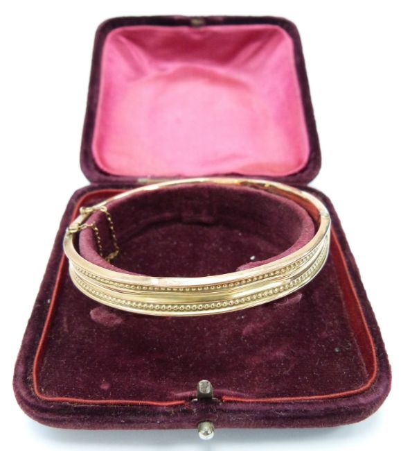 A 9ct rose gold bangle in original box, 8.9g